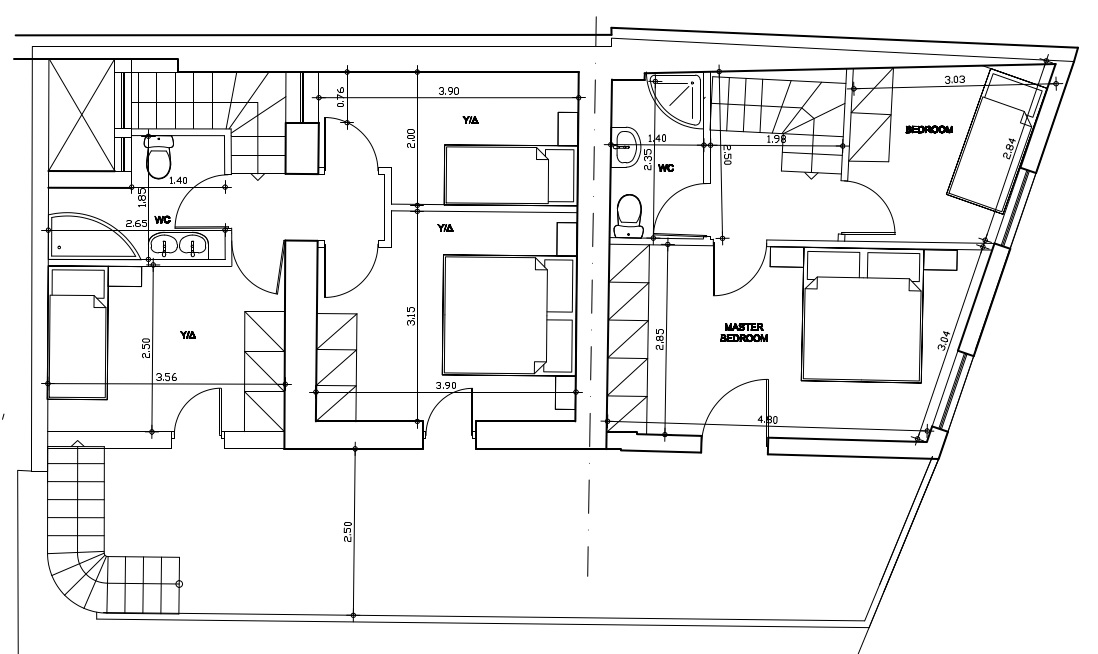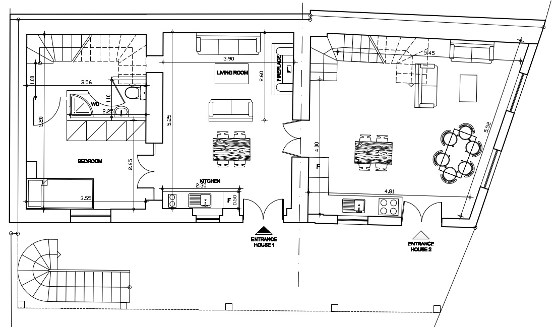 House A (104 sq.m.) spread over two floors (52 sq.m. each), features on the Ground Floor an Open-plan kitchen and living area with air conditioning, one bedroom, and a bathroom. An internal wooden staircase leads to the First Floor with Three bedrooms (all with AC), a bathroom, and a balcony overlooking the courtyard.