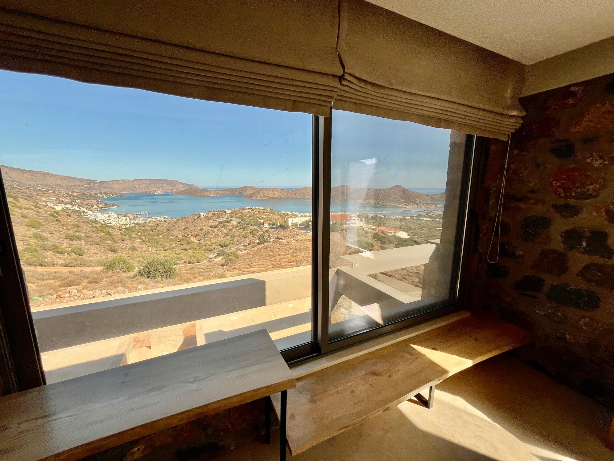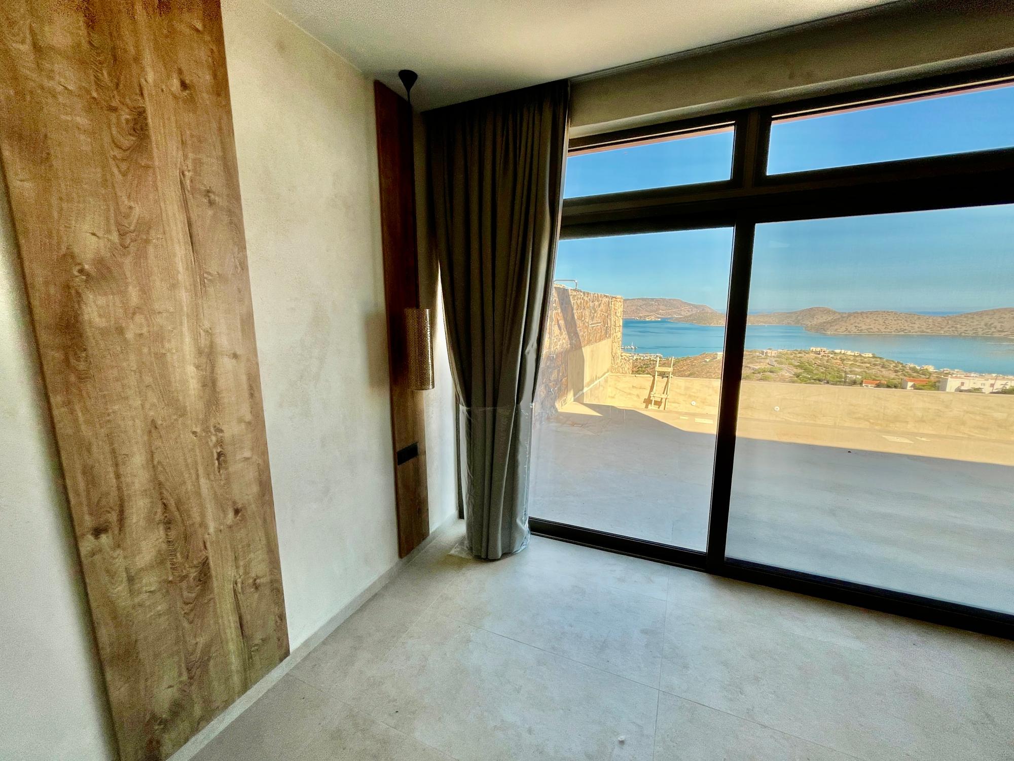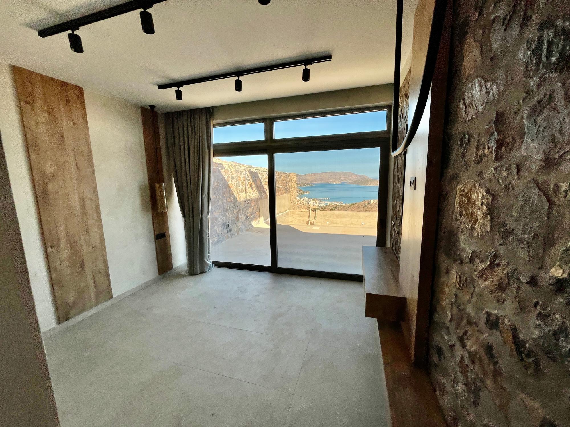 An open-plan living and kitchen area and a comfortable bedroom with an en-suite shower room. Both from the living room and from the bedroom, large glass doors open onto a generous terrace with a private pool, offering unobstructed views of the sea and the Elounda Bay.