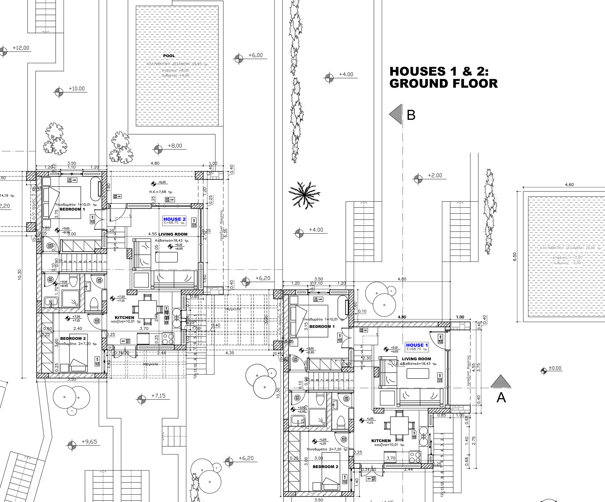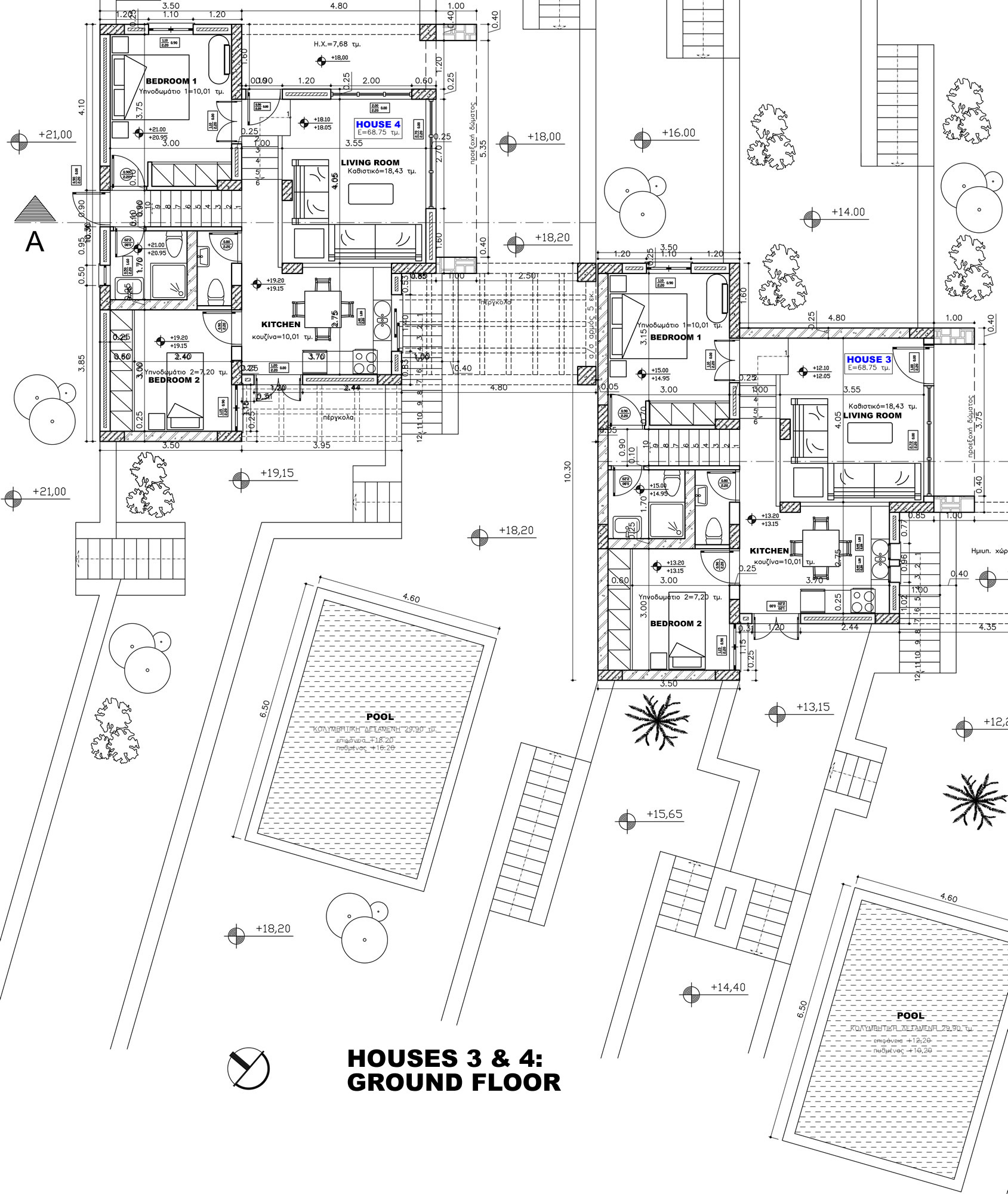 It already has a building license for four 2-bedroom bunglows of 68.75 m2 each, each with a basement of 12.81 m2 and each with a private swimming pool of 29.90 m2.