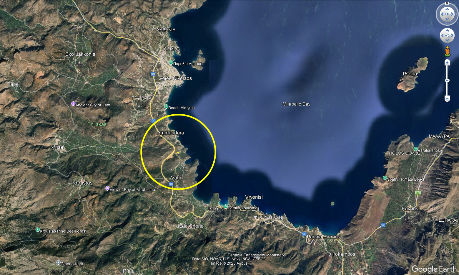Building plot, nicely positioned in the area of Vathi, south of the town of Agios Nikolaos, Crete, only 370m away (on a straight line) from the sea.